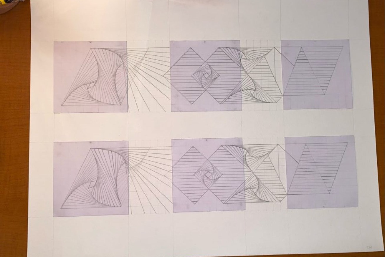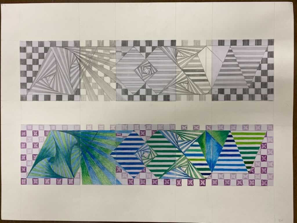 ThisThis is a combination of three drawings to create one big drawing. The left is composed of triangles, the middle diamonds, and the right triangles.